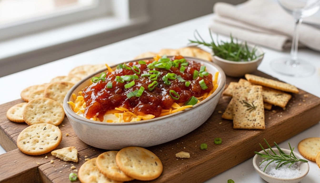 The mango chutney is the ingredient that makes this recipe genuinely special and completely distinctive. Sweet, tangy, warmly spiced, and studded with pieces of soft fruit, it introduces a layer of flavor that is entirely unexpected alongside cheese and crackers but works with remarkable harmony. The combination of sharp cheddar and mango chutney in particular is one of those classic pairings that sounds unusual until you try it — at which point it immediately makes complete sense. The sweetness of the chutney balances the sharpness of the cheddar, the warm spices complement the richness of both cheeses, and the whole thing has a complexity that makes people reach for another cracker before they have even finished the first one.